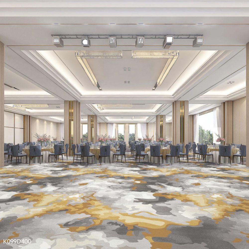 Ngoài ra, Thảm K099D400 còn sở hữu nhiều ưu điểm khác như khả năng cách âm tốt giúp giảm tiếng ồn và tạo nên không gian yên tĩnh, dễ chịu, khả năng chống tĩnh điện, đảm bảo an toàn khi di chuyển, bề mặt êm ái tạo cảm giác thoải mái khi bước chân, đồng thời dễ dàng vệ sinh và bảo trì. Chính sự kết hợp hài hòa giữa độ bền, thẩm mỹ, an toàn, thân thiện môi trường đã giúp thảm Axminster trở thành lựa chọn ưu tiên cho các công trình cao cấp như khách sạn 4–5 sao, trung tâm hội nghị, resort, khu nghỉ dưỡng, nhà hàng sang trọng và các dự án yêu cầu tiêu chuẩn quốc tế.