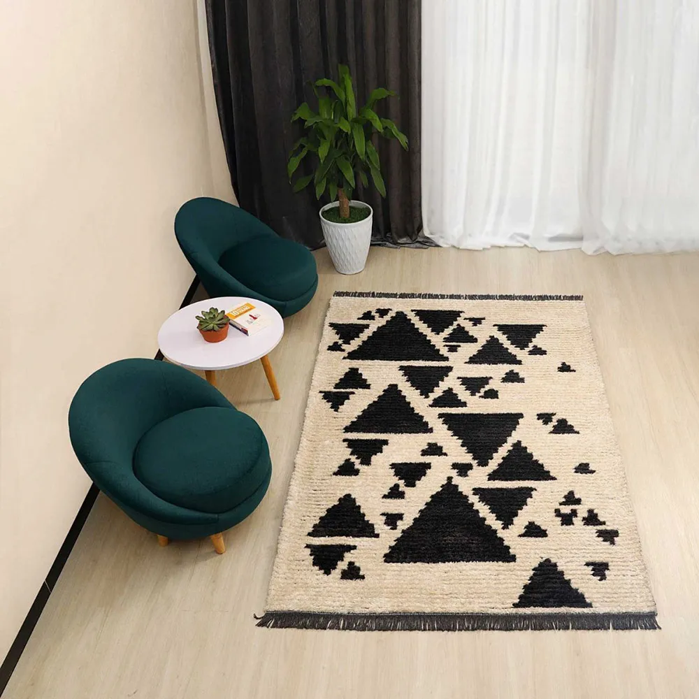 Thảm trang trí F279A có phong cách Boho và Tribal với họa tiết thổ cẩm tam giác được xếp lớp độc đáo. Bề mặt thảm được dệt theo các đường ngang, tạo kết cấu gợn sóng, giúp tăng chiều sâu và sự ấm áp cho không gian. Phần viền có tua rua ngắn ở hai đầu, làm tăng tính thủ công và tự nhiên cho thiết kế. Tấm thảm này phù hợp với phong cách nội thất Minimalist, Modern, Scandinavian hay Industrial.