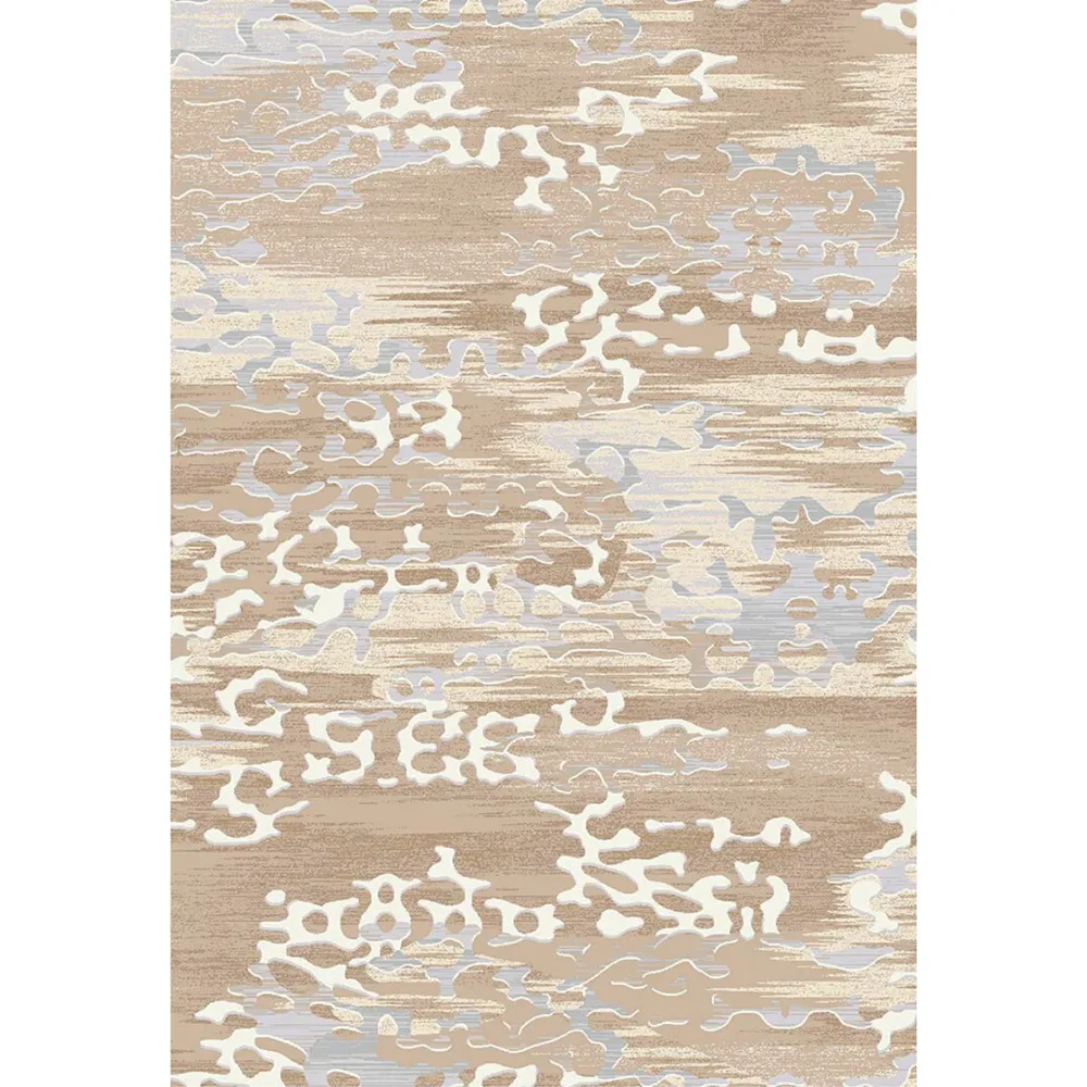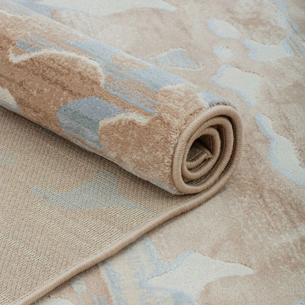 - Thiết Kế Tinh Tế: Thảm sở hữu thiết kế dệt nổi, gợi liên tưởng đến những đường nét chạm khắc tinh tế của thiên nhiên, mang đến cảm giác mềm mại và uyển chuyển. Sự hòa quyện của các sắc thái nâu vàng, trắng kem và xanh xám tạo nên hiệu ứng thị giác loang màu tự nhiên, đầy cuốn hút.