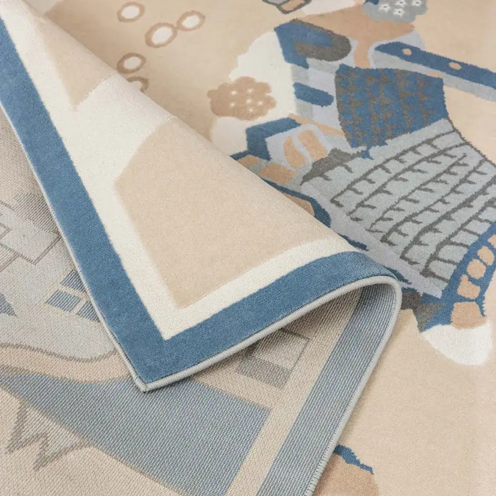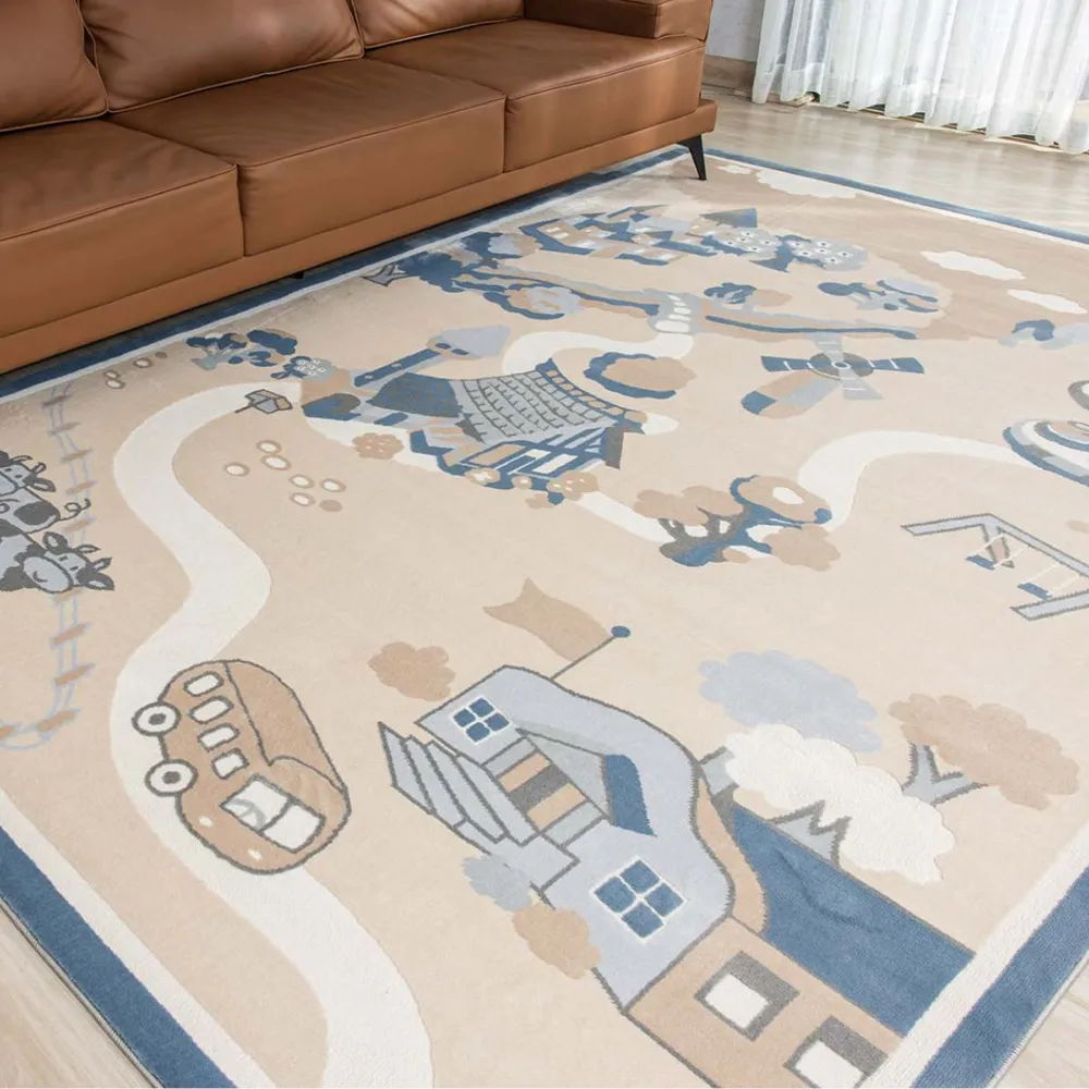 - Thiết Kế Tinh Tế: Thảm được thiết kế với họa tiết dệt nổi tinh xảo, tái hiện khung cảnh đồng quê thanh bình. Công nghệ phối màu hiện đại đã mang đến một bức tranh làng quê chân thực, gần gũi với các gam màu pastel dịu nhẹ như xanh lam, be và nâu nhạt, tạo nên không gian ấm cúng và thư thái. Viền thảm được thiết kế tinh tế với tông màu xanh thanh lịch, mang đến sự cân bằng thị giác hoàn hảo và làm nổi bật vẻ đẹp hiện đại cho không gian sống.