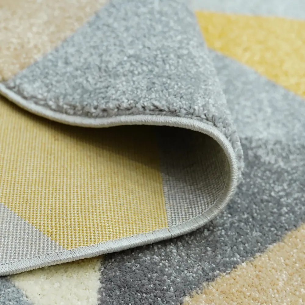 - Màu Sắc Tinh Tế: Màu sắc của thảm là bản hòa âm nhẹ nhàng giữa sắc vàng tươi sáng, xám trung tính, trắng tinh khôi và nâu ấm dịu. Sự kết hợp khéo léo giữa các gam màu đối lập tạo nên một bảng màu vừa ấm áp, vừa thanh thoát. Vàng nổi bật như ánh nắng sớm, xám và nâu tạo chiều sâu trầm lắng, trong khi sắc trắng làm nền cho sự cân bằng. Nhờ cách chuyển tông mượt mà, màu sắc trên thảm không chỉ đẹp mắt mà còn mang lại cảm giác thư giãn cho người nhìn.